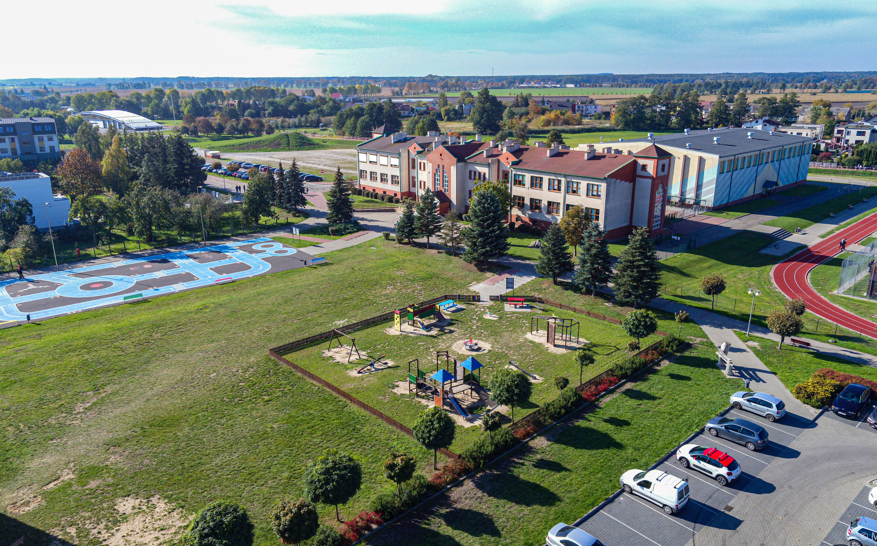 · boisko ze sztuczną nawierzchnią wraz z 4-torową bieżnią tartanową wyposażone w sztuczne oświetlenie