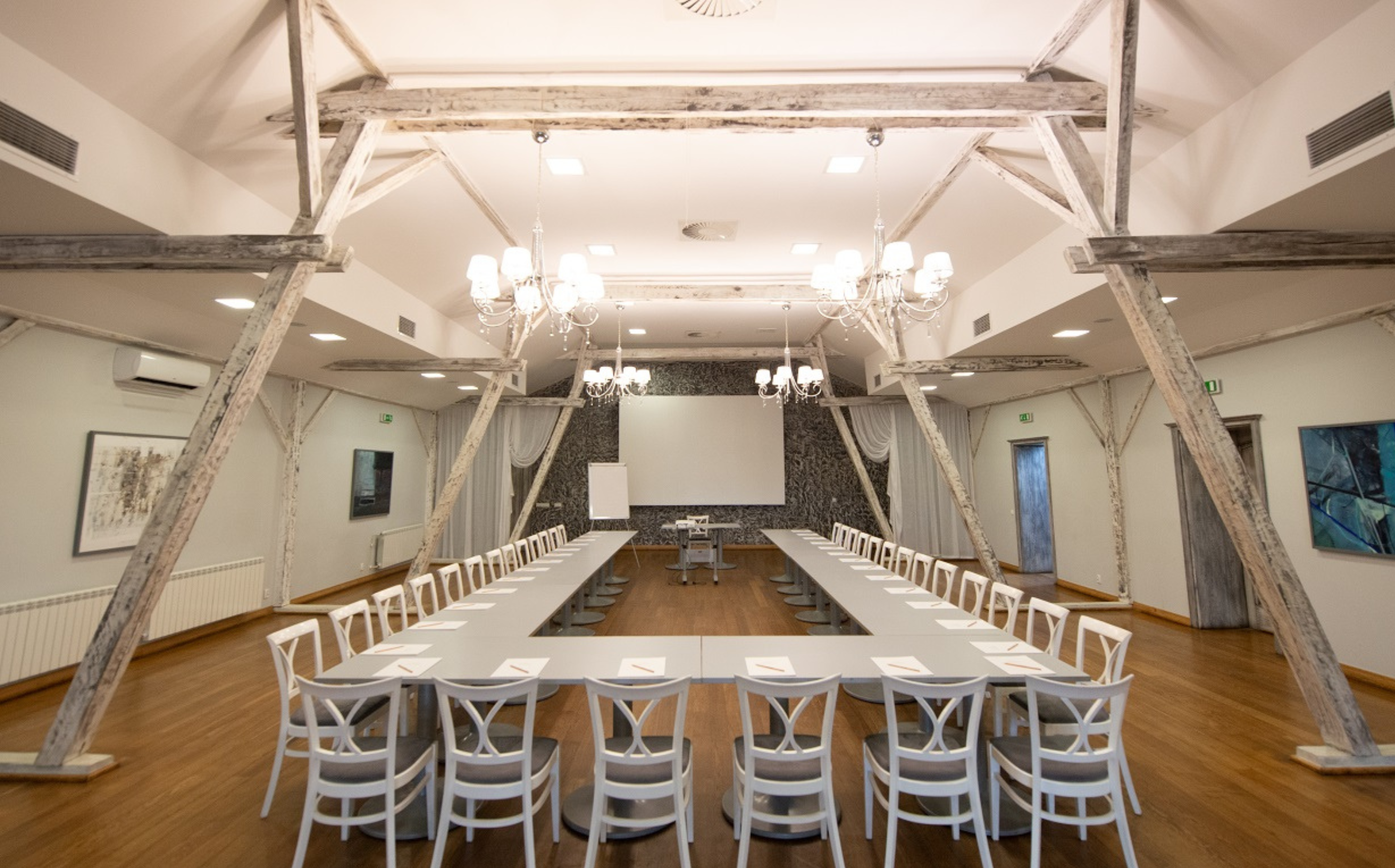 Sale wyposażone są w nagłośnienie, mikrofony bezprzewodowe, ekrany, flipcharty, bezpłatny dostęp do Internetu oraz projektory multimedialne.